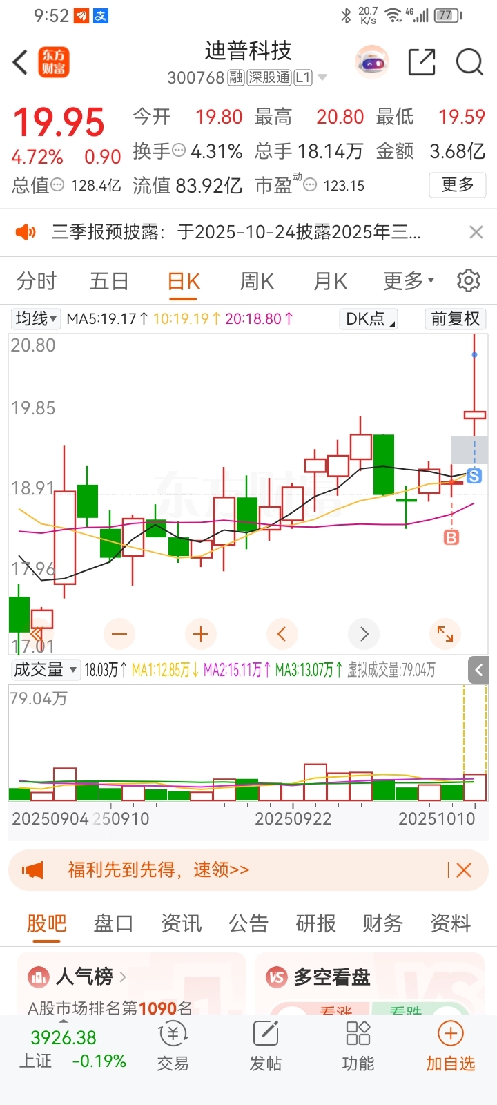 $迪普科技(SZ300768)$ 昨天看到某位小博主小亏卖了后,我才买进的!