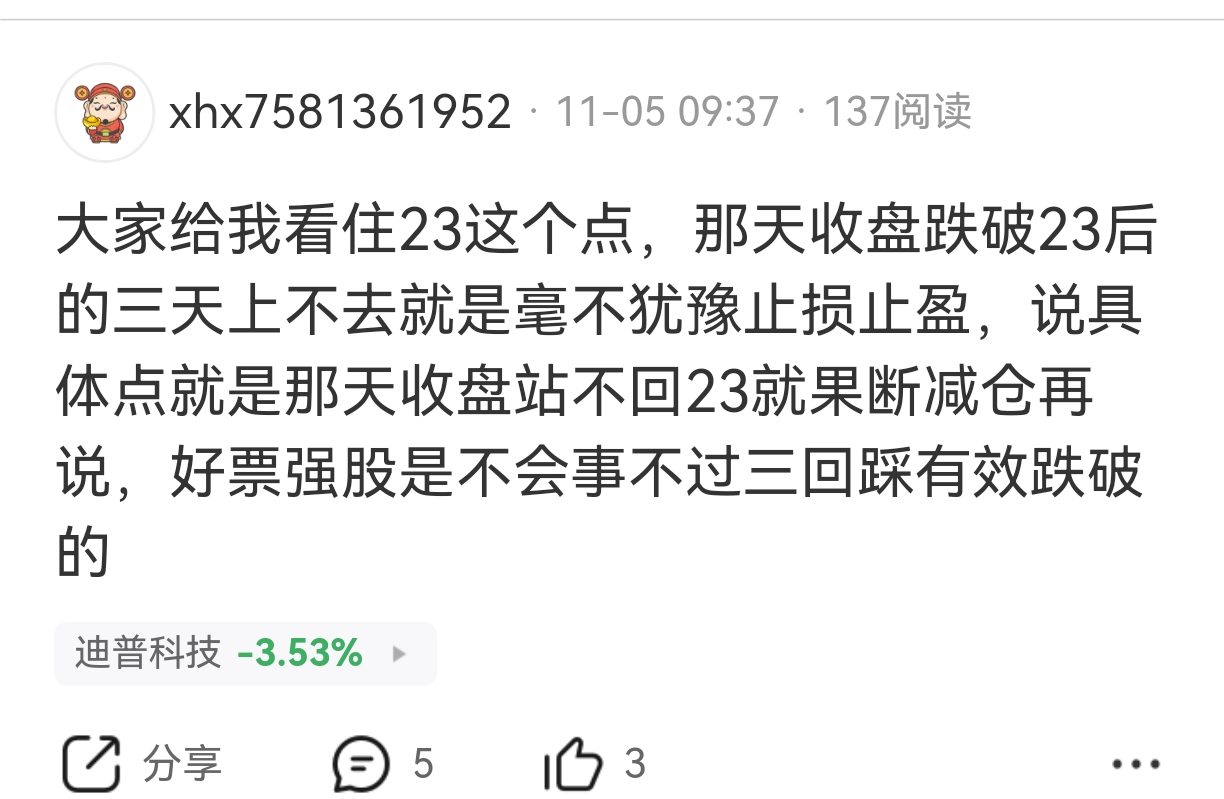 星期二那天尾盘两点二十几分打到23跌不下去,再回拉到收盘有放量,可是现在看是诱多,我判断错了,所以说那天收盘跌破23尾盘收不回果断减仓还是止盈止损,我中长线持有还是侥幸心理没有大幅减仓,接连三天杀跌已经验证了。现在躺平熬着再说,不等企稳就不动不加仓。有利润垫底一个星期的杀跌也肉疼啊,