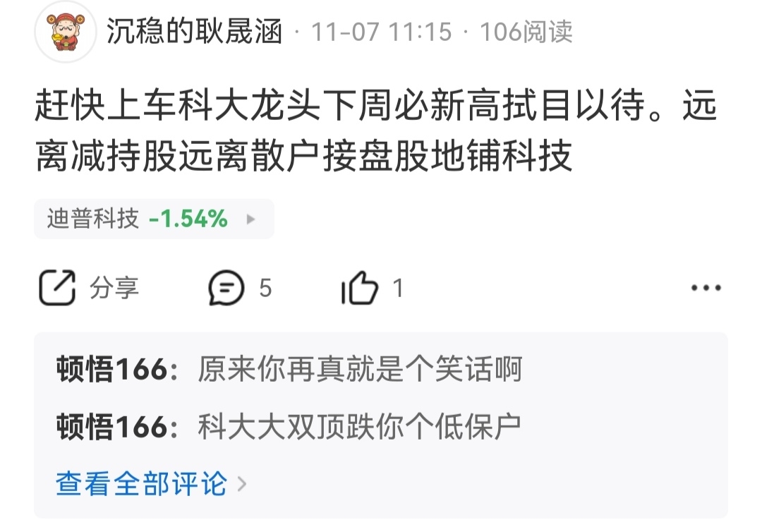 这人十一后一路恶意唱空迪普恶意,一路打脸,上个星期迪普开始回调杀跌又恶意唱空迪普吆喝去追高上科大国创,此人险恶嘴脸提现的淋漓尽致,不是坏,真是大缺德。