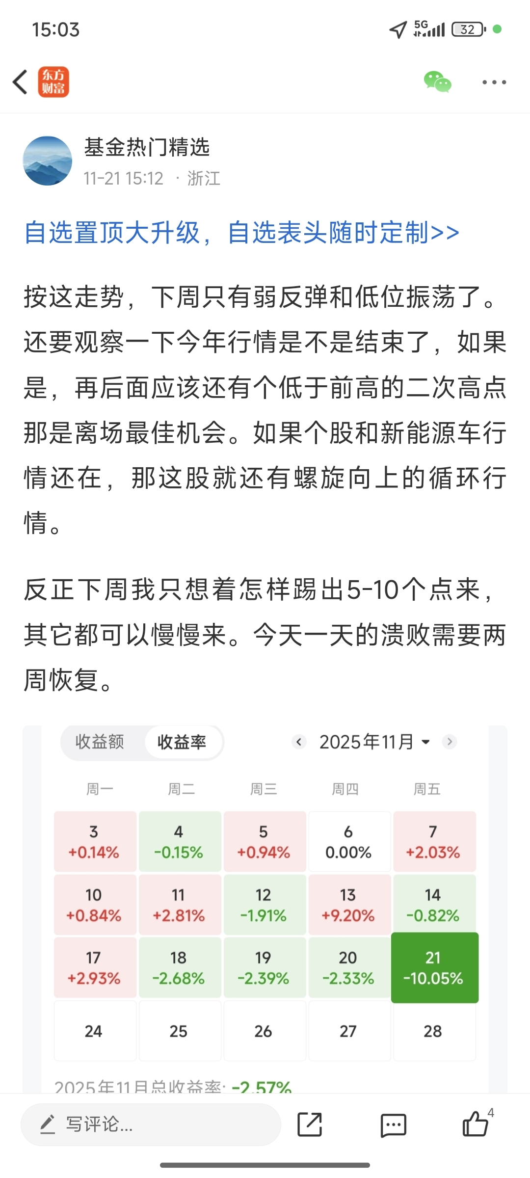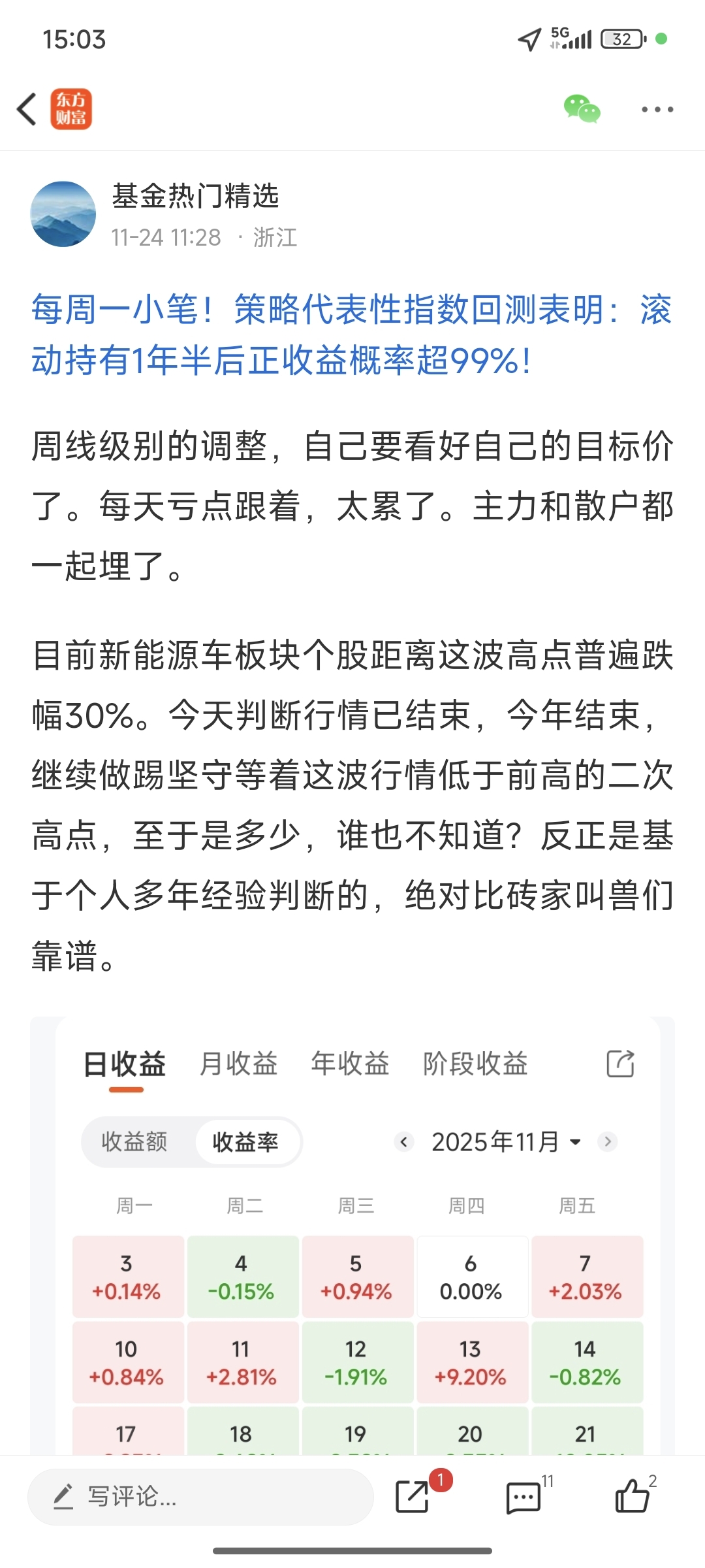 上周判断的低位振荡和弱反弹,后面就看有没有低于前低的二次高点了。没在新能源车混5年以上你敢这样判断?这就叫经验,再去看看那些持不同观点的人怎么说的吧,我只能呵呵了。
