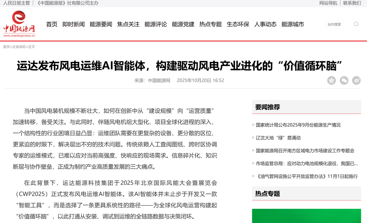 【“链”达CWP】中国能源网:运达发布风电运维AI智能体,构建驱动风电产业进化的