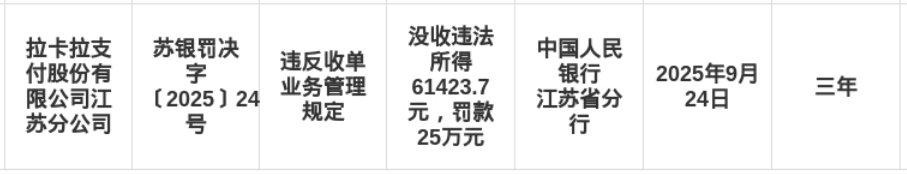 拉卡拉支付被罚25万,涉违反收单业务管理规定