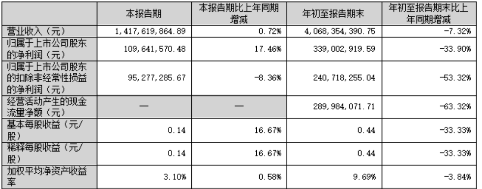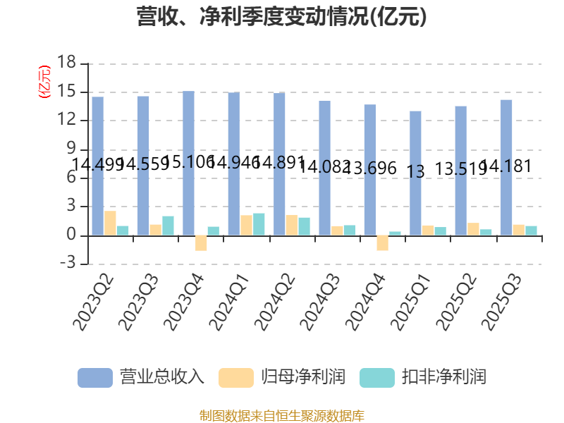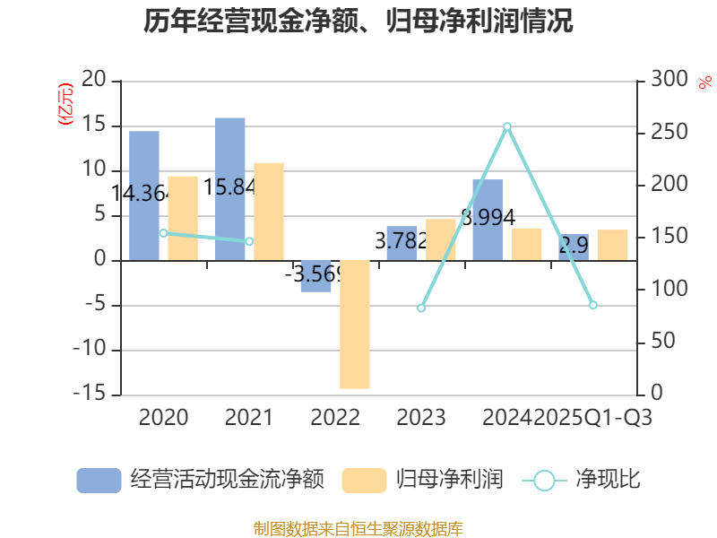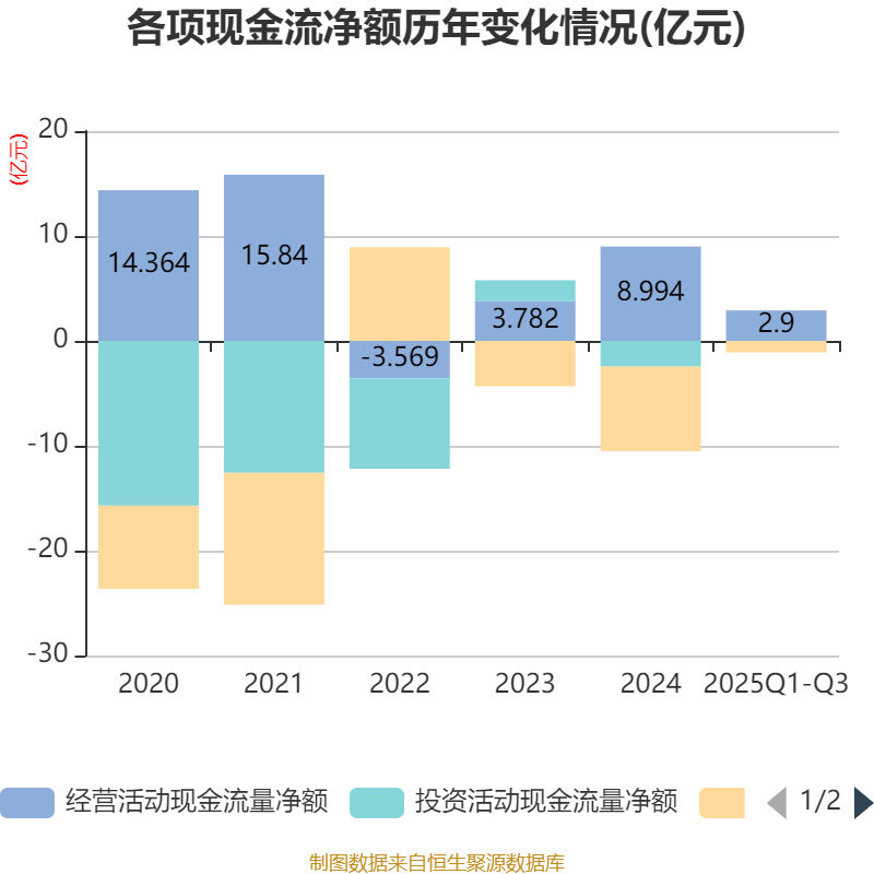 2025年前三季度,公司经营活动现金流净额为2.9亿元,同比下降63.32%;筹资活动现金流净额-1.1亿元,同比增加7.37亿元;投资活动现金流净额137.82万元,上年同期为-1.99亿元。