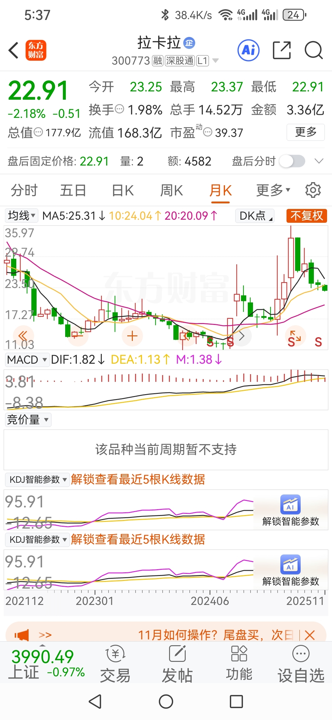 $拉卡拉(SZ300773)$ 从去年的11元涨起来的,现在22.9真不好说,二十月均线是20