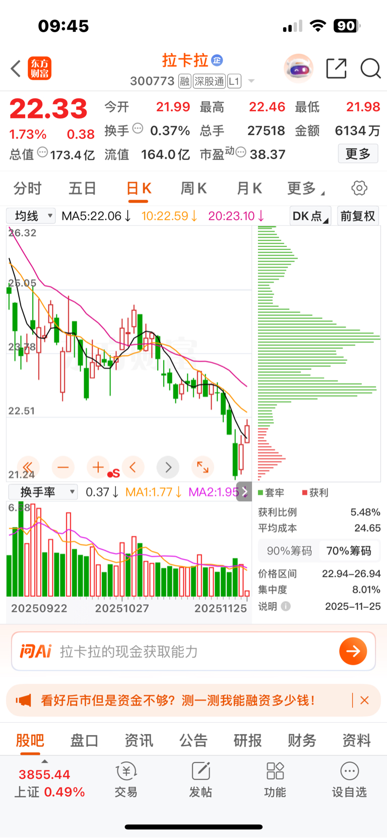 虽然很想让拉卡拉涨停吃肉,但是看日k这个套牢盘,问题很大!
