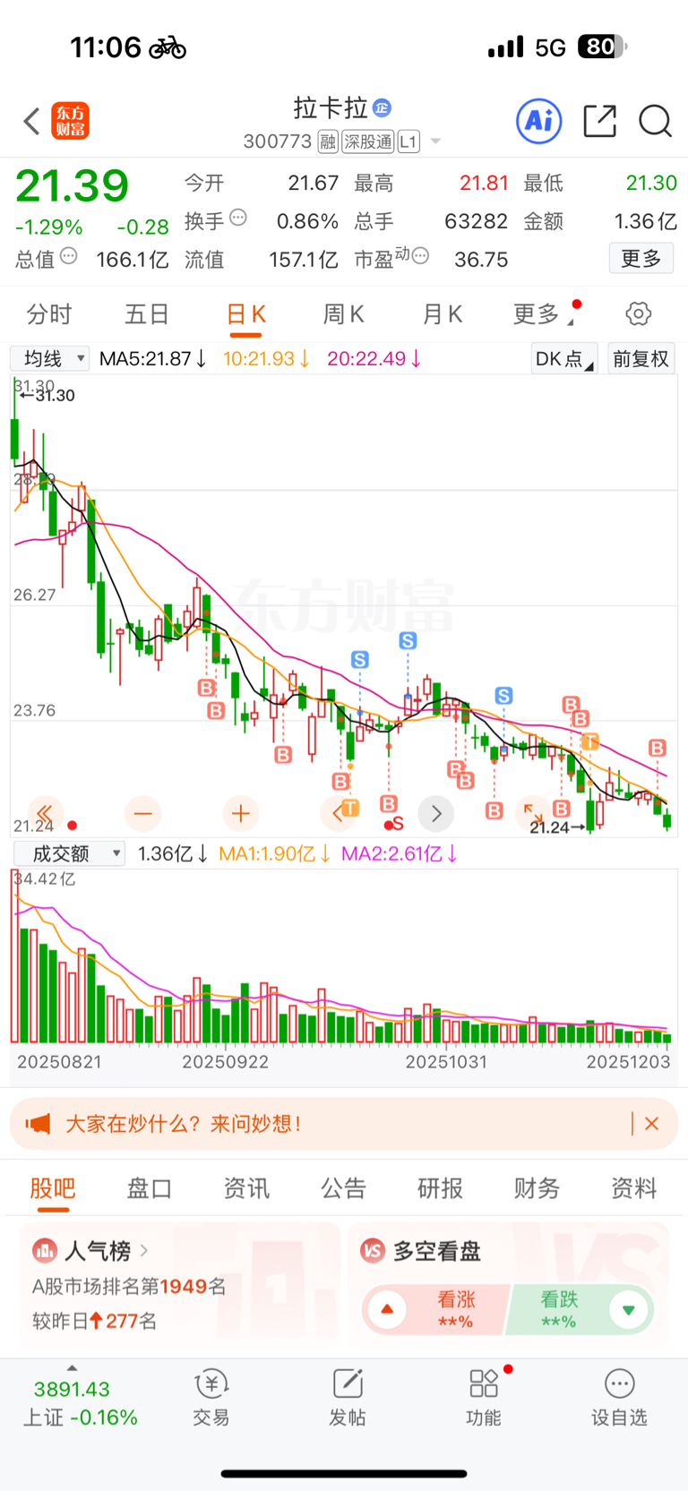 $拉卡拉(SZ300773)$ 加油跌。我不回本一股不卖