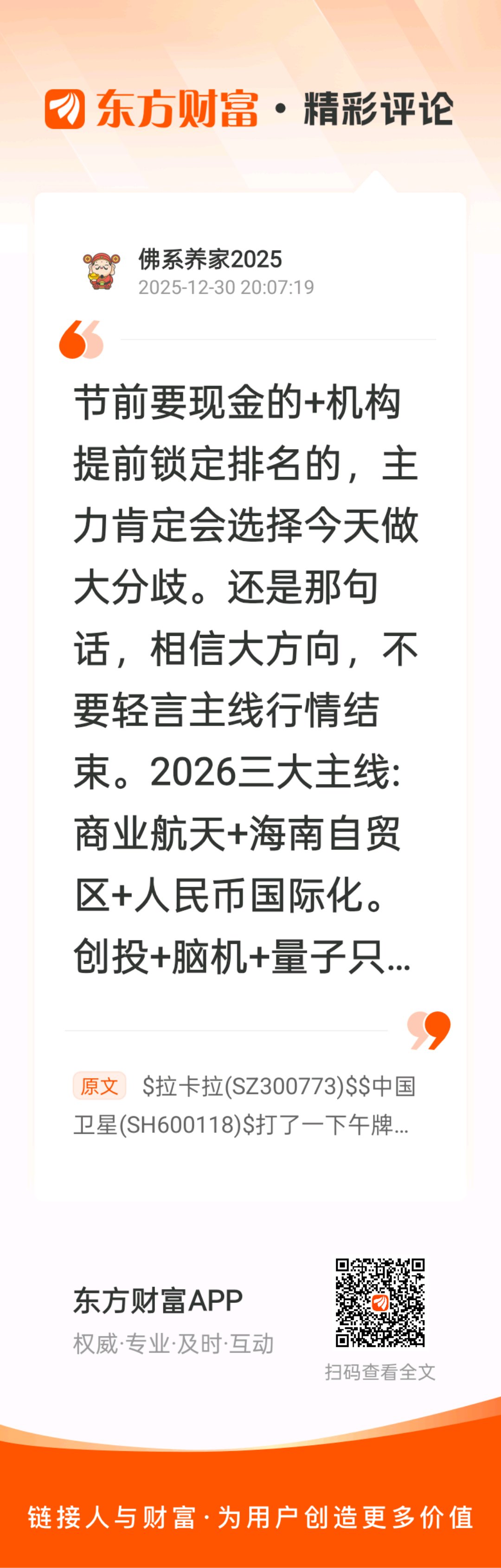 $拉卡拉(SZ300773)$$中国卫星(SH600118)$$*ST铖昌(SZ001270)$//@佛系养家2025 :节前要现金的+机构提前锁定排名的,主力肯定会选择今天做大分歧。还是那句话,相信大方向,不要轻言主线行情结束。2026三大主线:商业航天+海南自贸区+人民币国际化。创投+脑机+量子只是穿插的小题材。AI硬件得看年报是否符合预期再判断。AI应用主看AI眼镜能否爆量。另外就是资源股,可能会有局部机会,CPI大幅转正之前,PPI不可能大幅上涨。