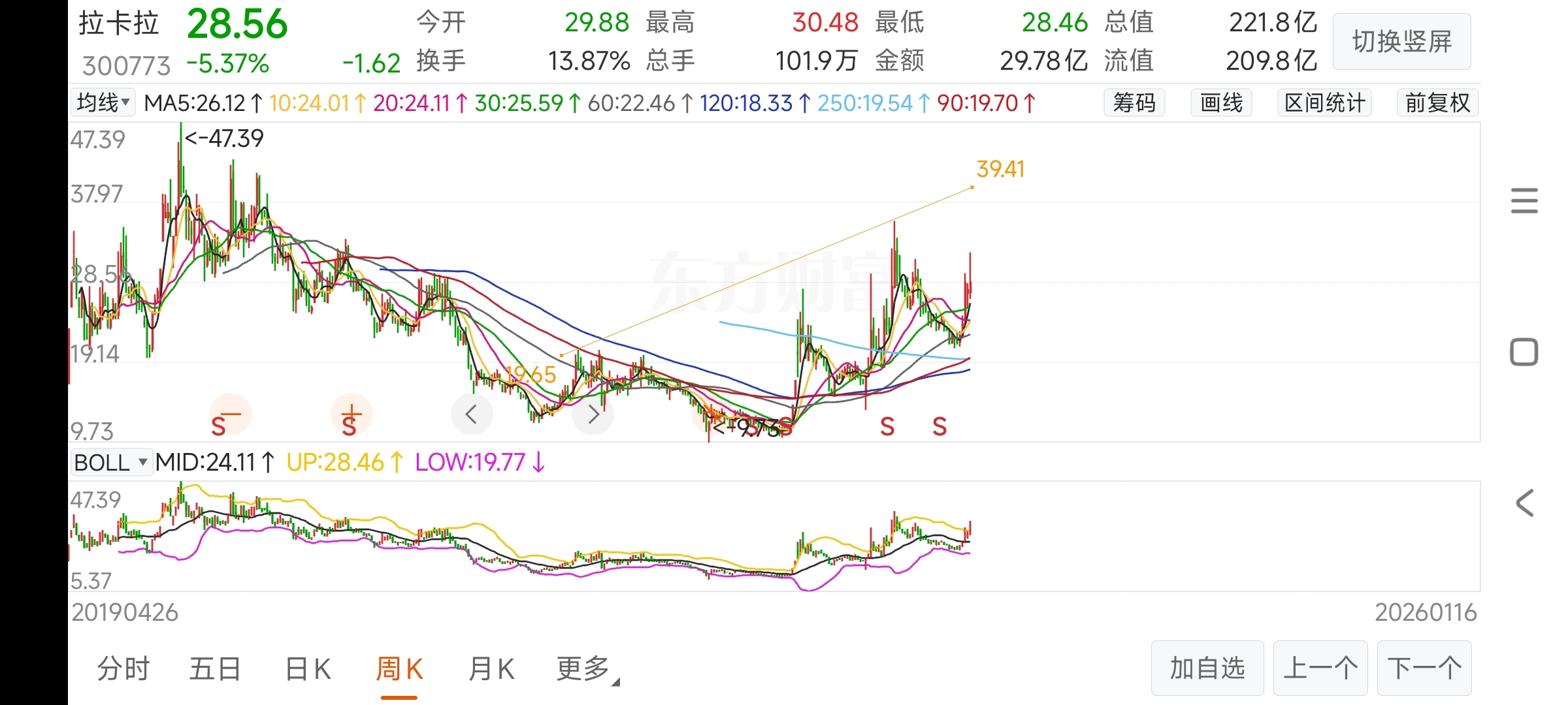 拉卡拉周线复合头肩底颈线40块钱附近,过不去右肩需要做复合右肩,右肩高点在40附