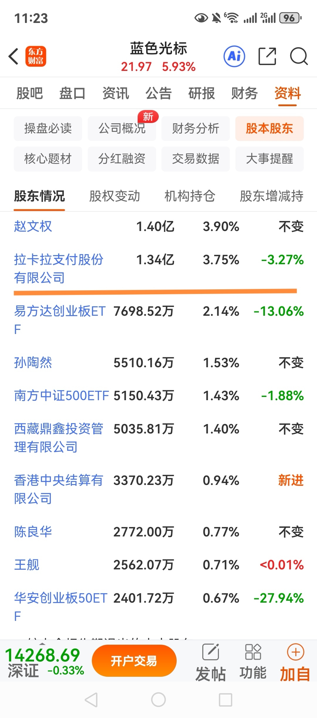 拉卡拉300773持有蓝色光标1.34亿股,今年一季度蓝色光标涨幅93%,拉卡拉