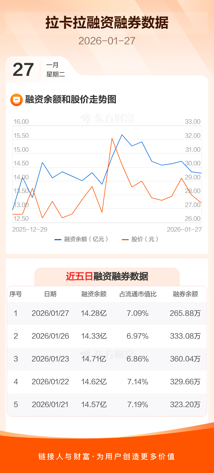 交易所最新数据显示,拉卡拉于2026年1月27日获融资买入1.58亿元,融资偿还1.63亿元,当日融资净偿还472.63万元。目前,该股融资余额14.28亿,占流通市值比例为7.09%。