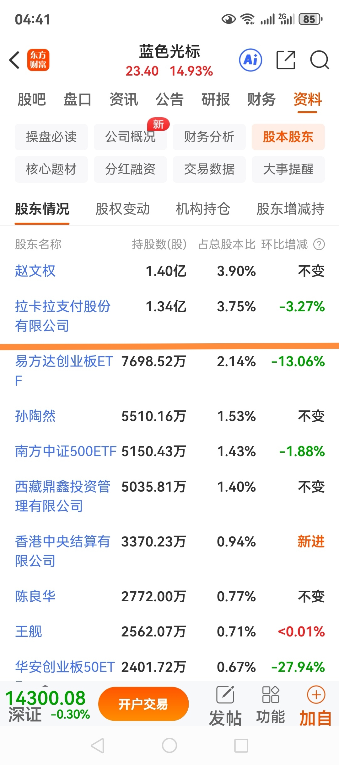 拉卡拉300773持有蓝色光标1.34亿股,2021年转让价格6.35元,去年1