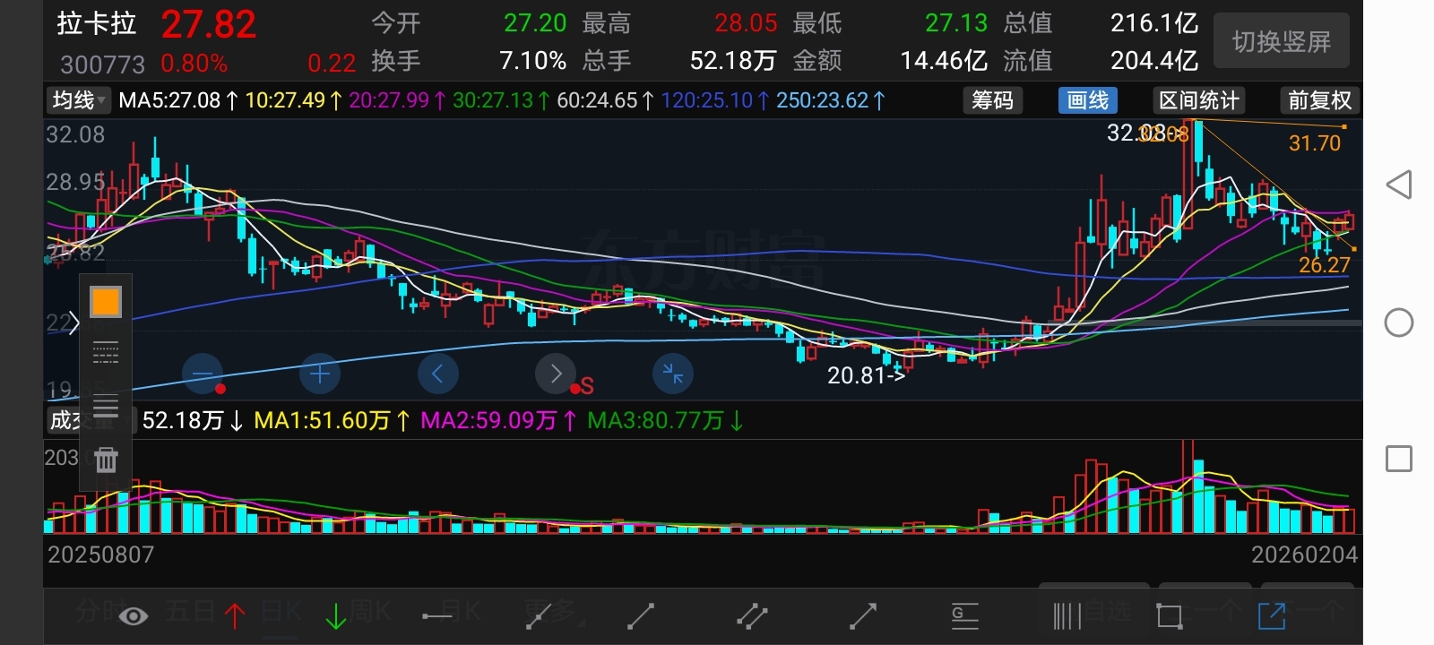 $拉卡拉(SZ300773)$ 你们别慌,小周期刚结束下降趋势,属于多头建仓阶段,已经空转多了