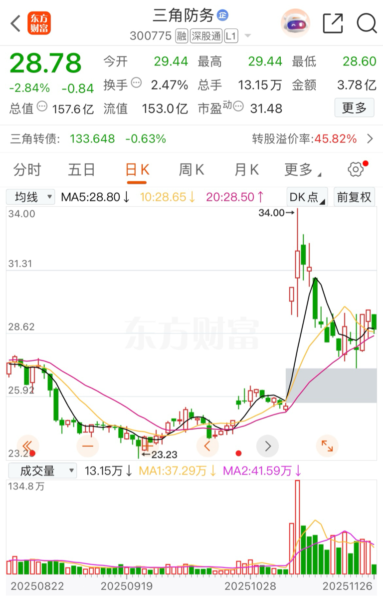 前几天$三角防务(SZ300775)$ 放量高开强势涨停,庄家成本高,抢一波回调,打算11月24日到28日短线操作,反弹8到10个点,回到30.6元问题大不大