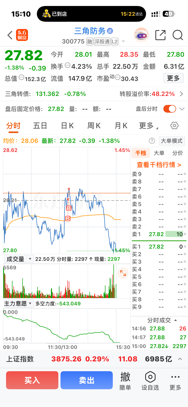 $三角防务(SZ300775)$ 前几天29以上卖了今天回来就被套
