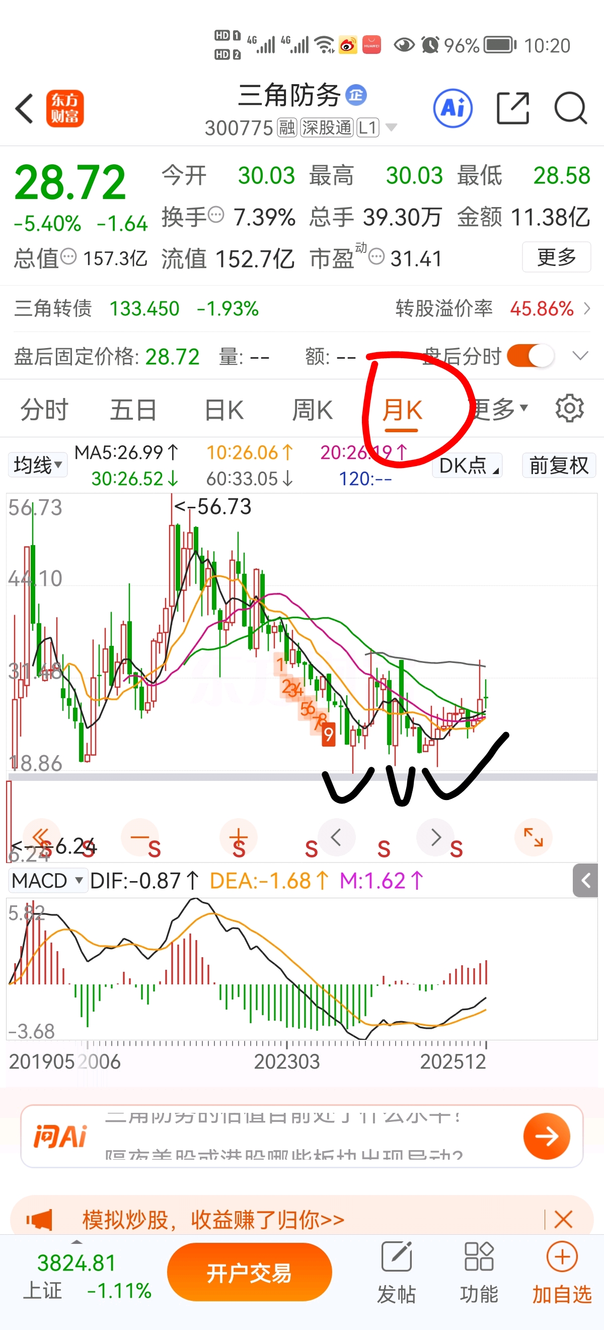 $三角防务(SZ300775)$ 月线三根脚脚,看你咋跌,我不怕