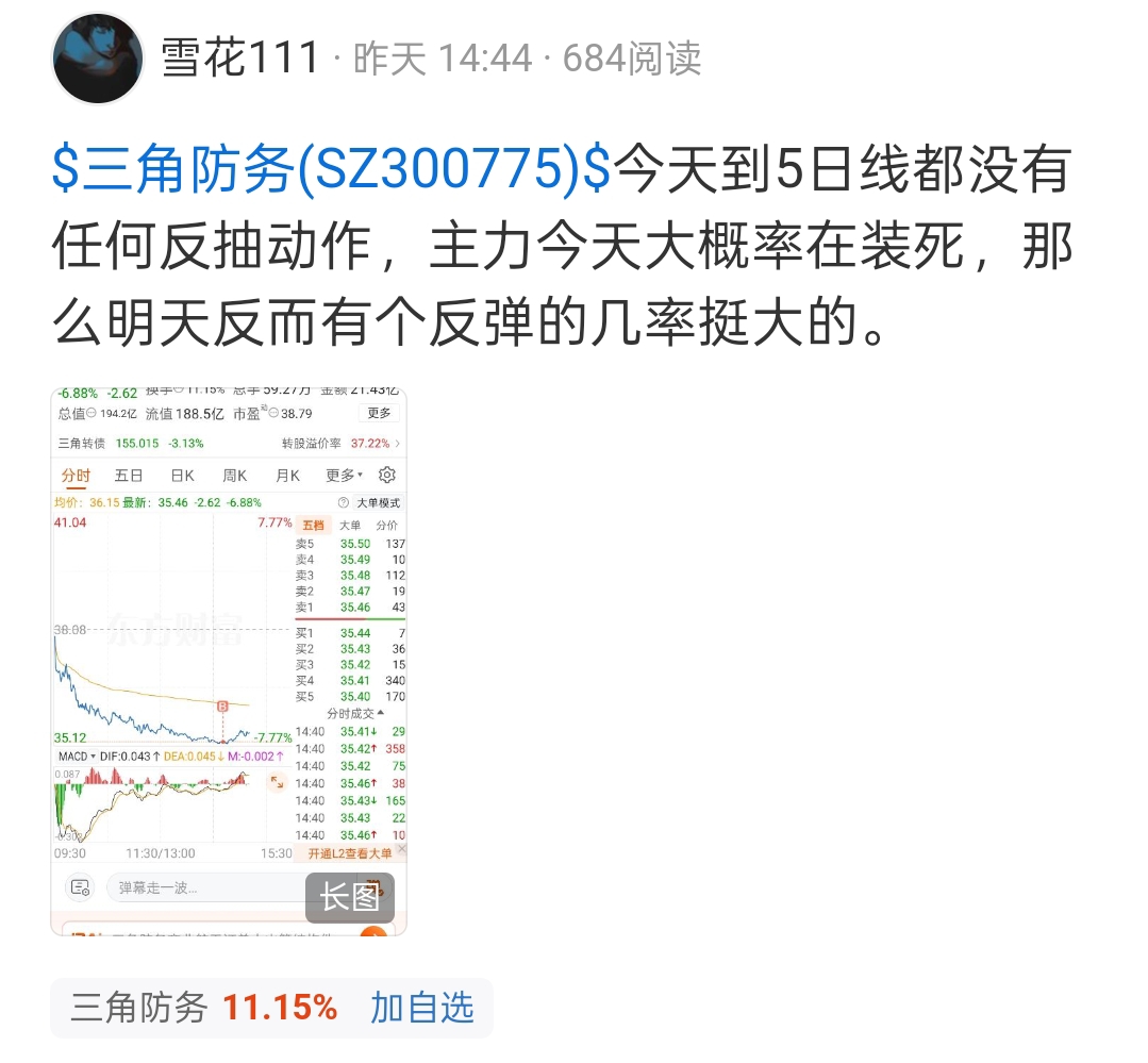 $三角防务(SZ300775)$ 昨天只是预期今天有个小反弹,到5日线差不多,但是今天分时打到5日线的时候不但没回落反而大单直接果断向上买,那么我认为昨天是洗盘,今天是吸筹概率很大,选择今天继续加一笔,看明天表现。