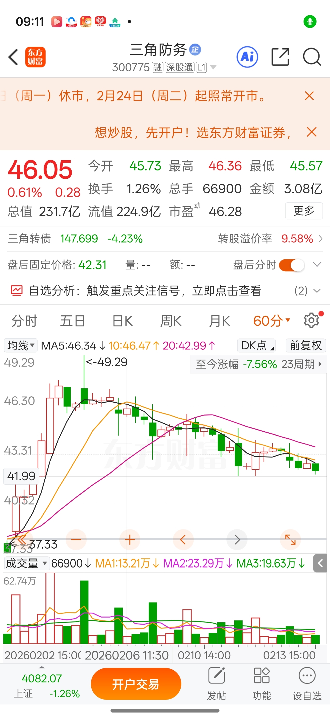 $三角防务(SZ300775)$ 大家看60分钟这个阳线42开盘价,有三次都碰了这个开盘价都被拉上去了,所以只要收盘不破42,就拿在里面做t,破了就走