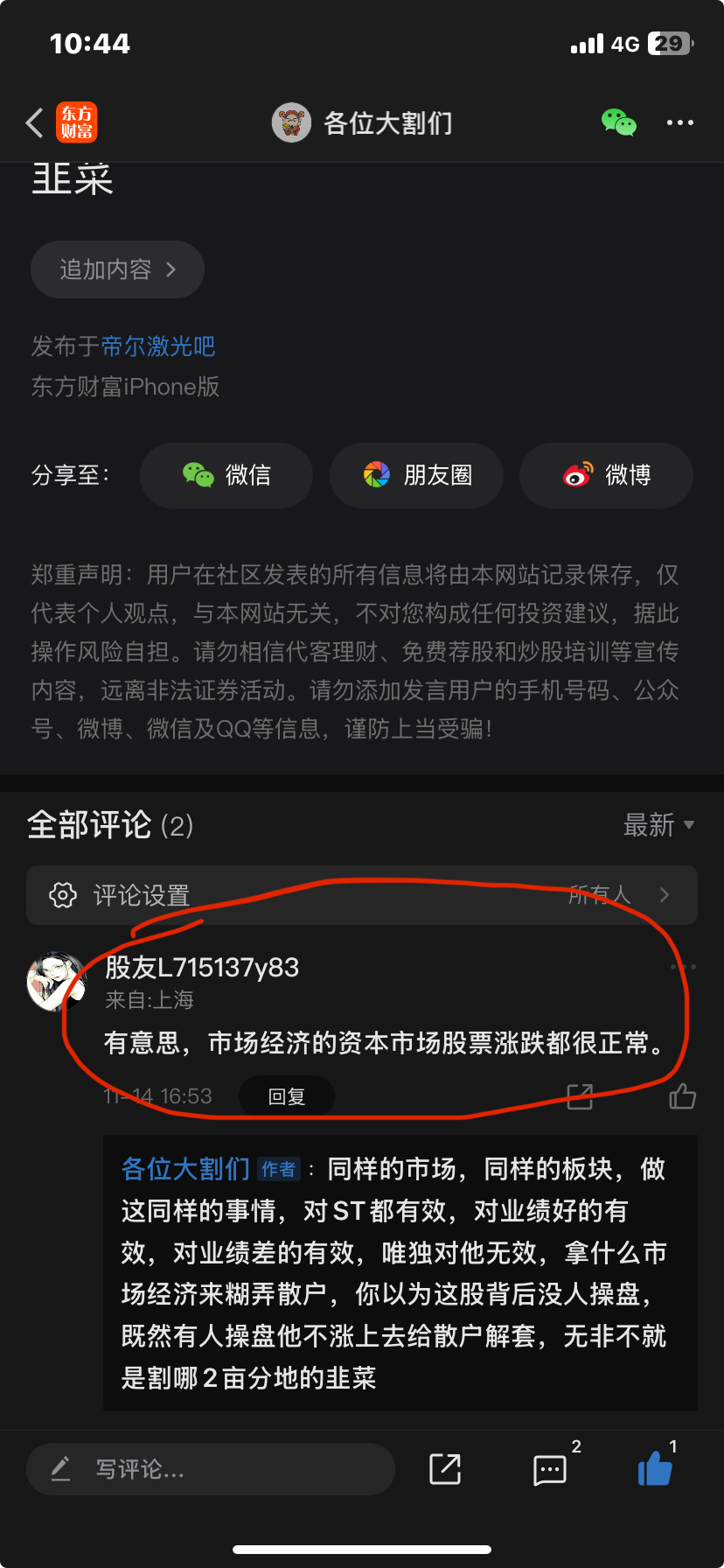温馨提示: 1.根据《证券法》规定,禁止编造、传播虚假信息或者误导性信息,扰乱证券市场;2.用户在本社区发表的所有资料、言论等仅代表个人观点,与本网站立场无关,不对您构成任何投资建议。用户应基于自己的独立判断,自行决定证券投资并承担相应风险。《东方财富社区管理规定》