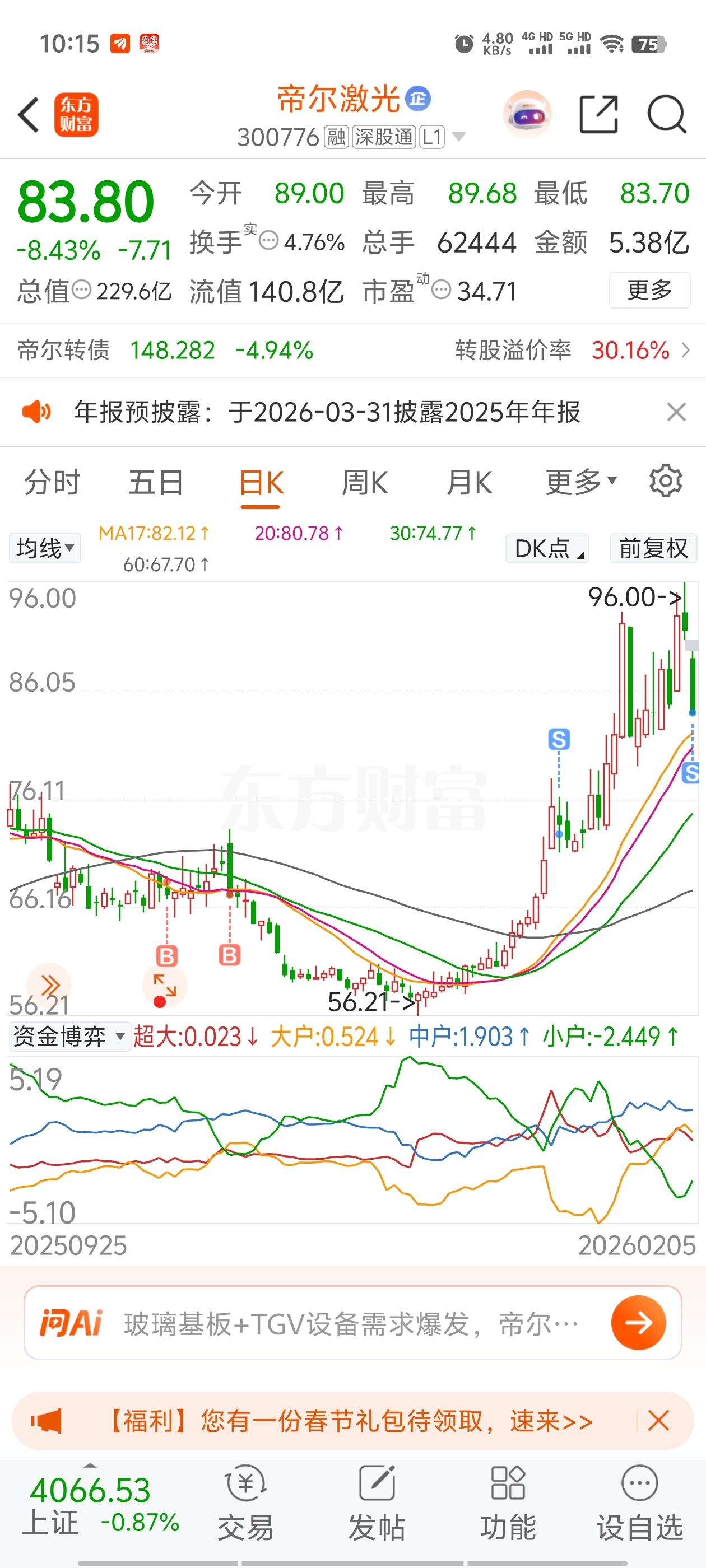 $帝尔激光(SZ300776)$ 卖的确实很心疼啊,有可能第二天会在反弹上来,但是因为我资金量太少,并且我分析主力在小小的出货,现在仍然是大盘周线死叉,并且顶背离没有走完,我如果不卖的话风险会更高,所以还是很心痛的卖掉了,