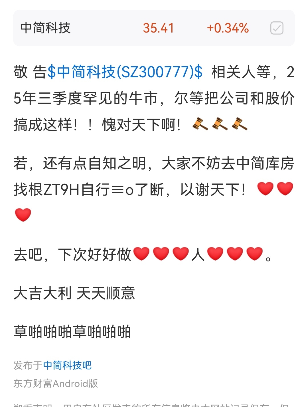 温馨提示: 1.根据《证券法》规定,禁止编造、传播虚假信息或者误导性信息,扰乱证券市场;2.用户在本社区发表的所有资料、言论等仅代表个人观点,与本网站立场无关,不对您构成任何投资建议。用户应基于自己的独立判断,自行决定证券投资并承担相应风险。《东方财富社区管理规定》