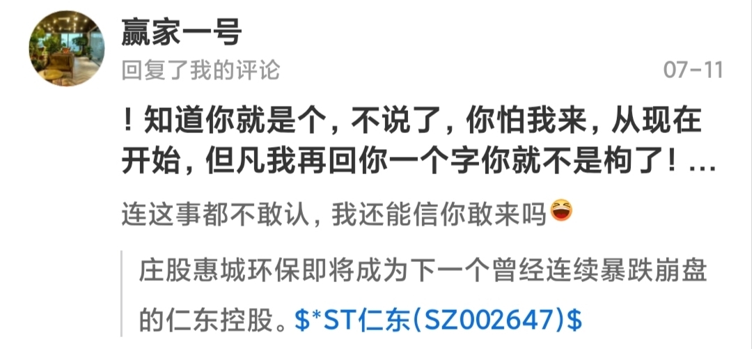 $惠城环保(SZ300779)$ 这人七月份说要崩,被我骂的构一样,现在腰斩都没到出来装了,骂完我就拉黑我的沙构,有人能联系到请告诉他,不要当构