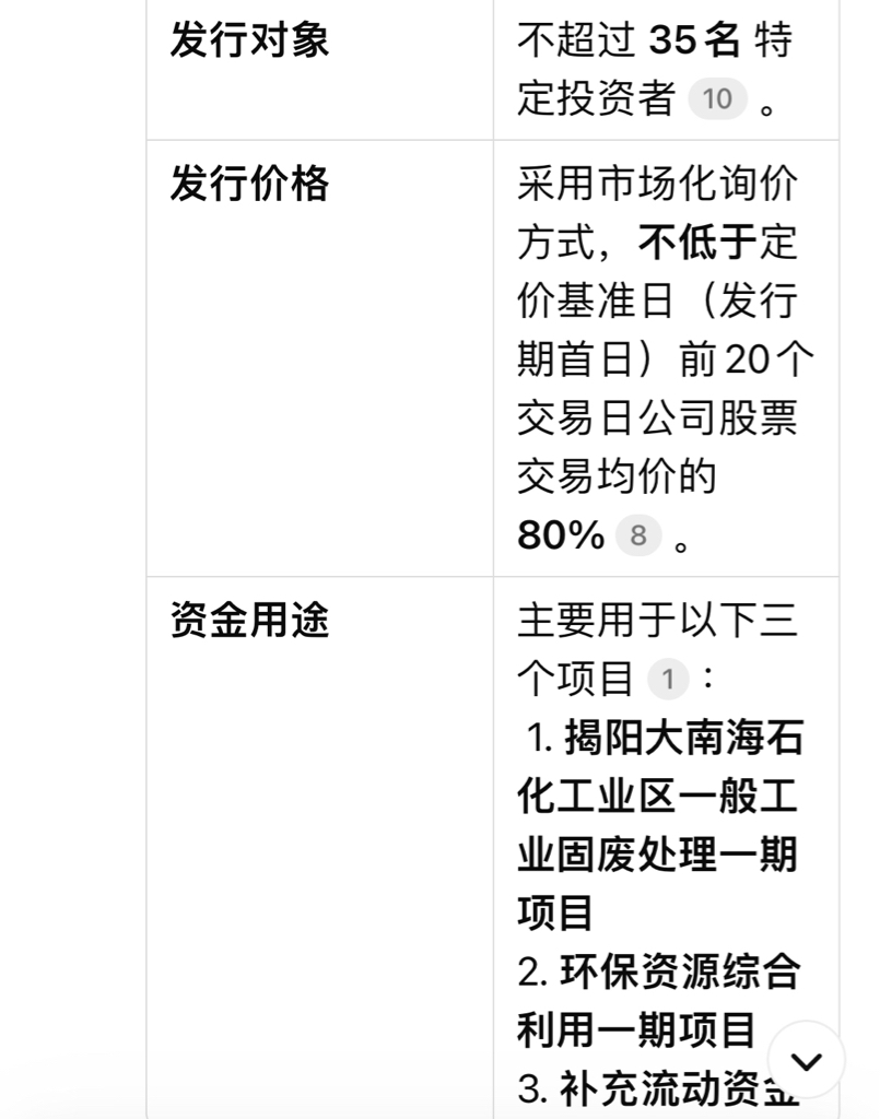 $惠城环保(SZ300779)$ 向不超过35名特定投资者,定向增发8.5亿元,增发价不低于发行期首日前20个交易日均价80%,用于揭阳大化工固废处理一期和环保资源综合利用及补充流动资金。