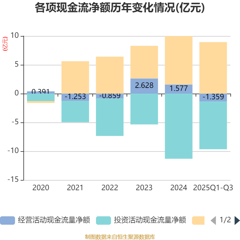 2025年前三季度,公司经营活动现金流净额为-1.36亿元,同比减少1.4亿元;筹资活动现金流净额8.94亿元,同比增加2.81亿元;投资活动现金流净额-8.3亿元,上年同期为-7.23亿元。