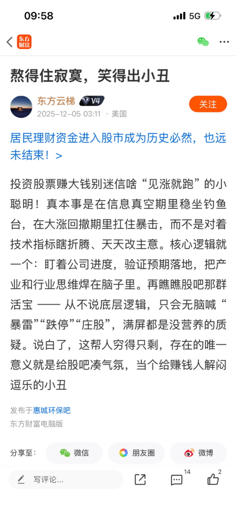$惠城环保(SZ300779)$ 大家注意啦。【熬得住寂寞,笑得出小丑】又出来了@东方云梯 看到这jiba人直接喷就完了,然后这jiba人彻底没影了,这股才安全