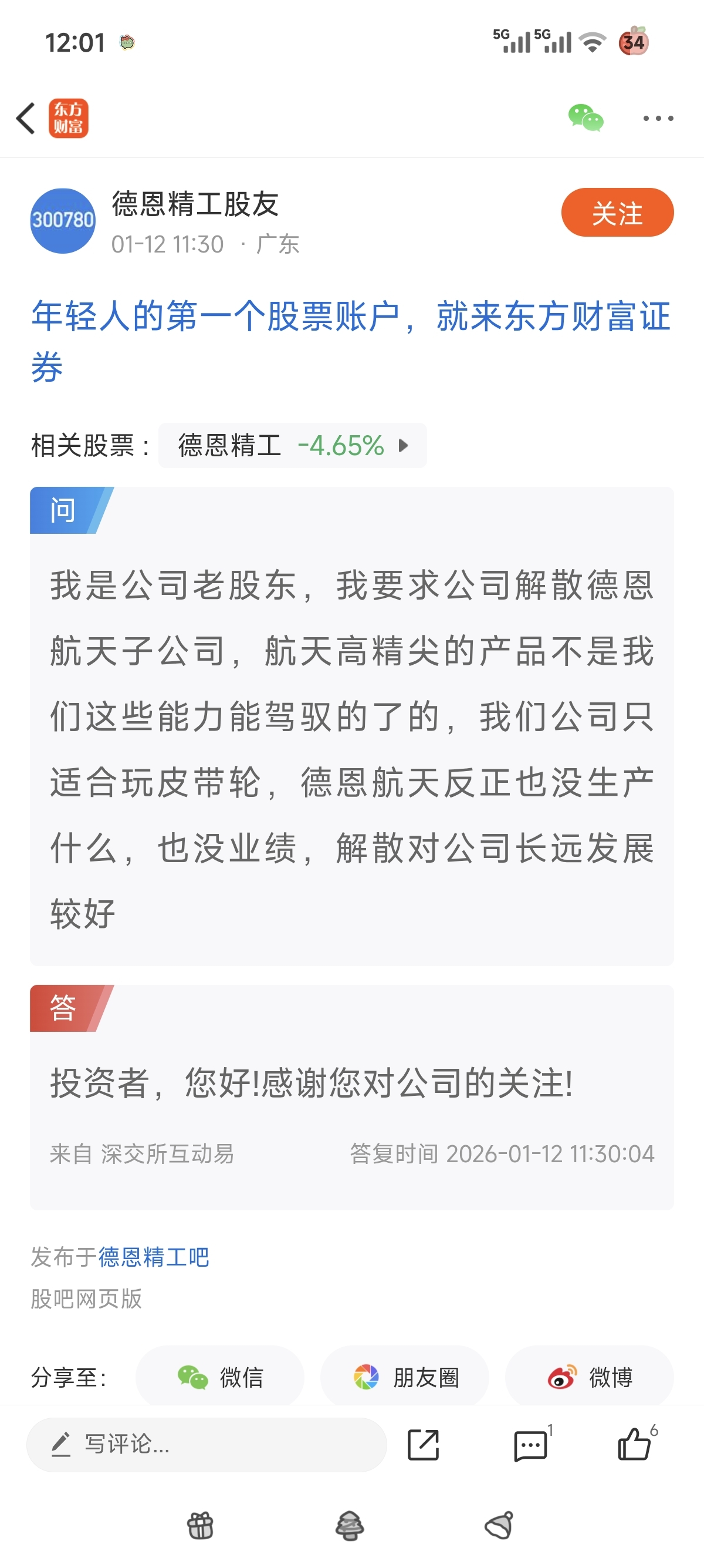 $德恩精工(SZ300780)$ 哈哈哈,董秘听进去意见了,估计晚上公告解散!