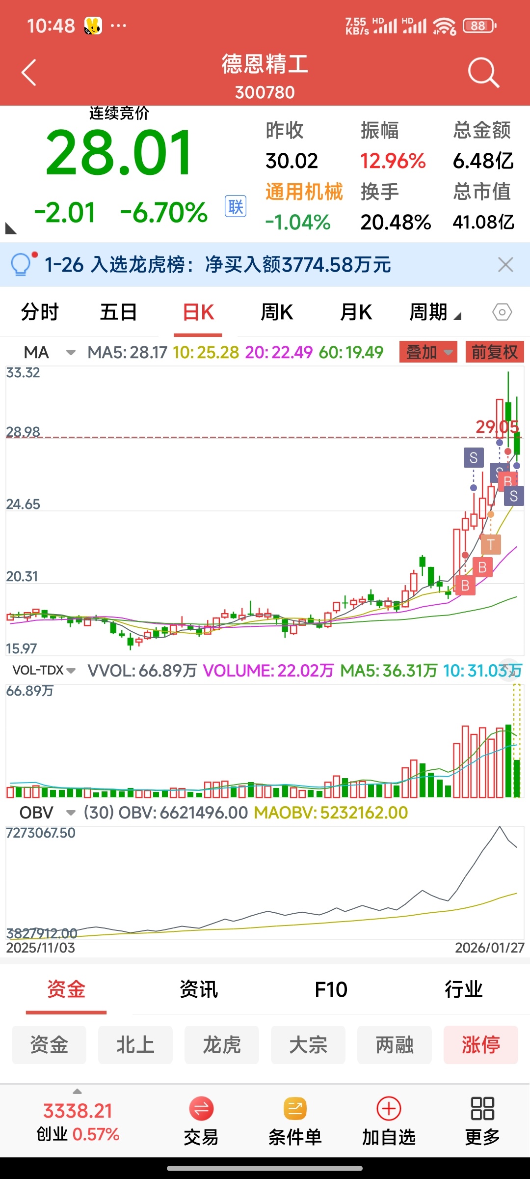 德恩早盘已经清仓,按照昨天的计划执行,这波行情应该是走到头了,后面应该就是阴跌了