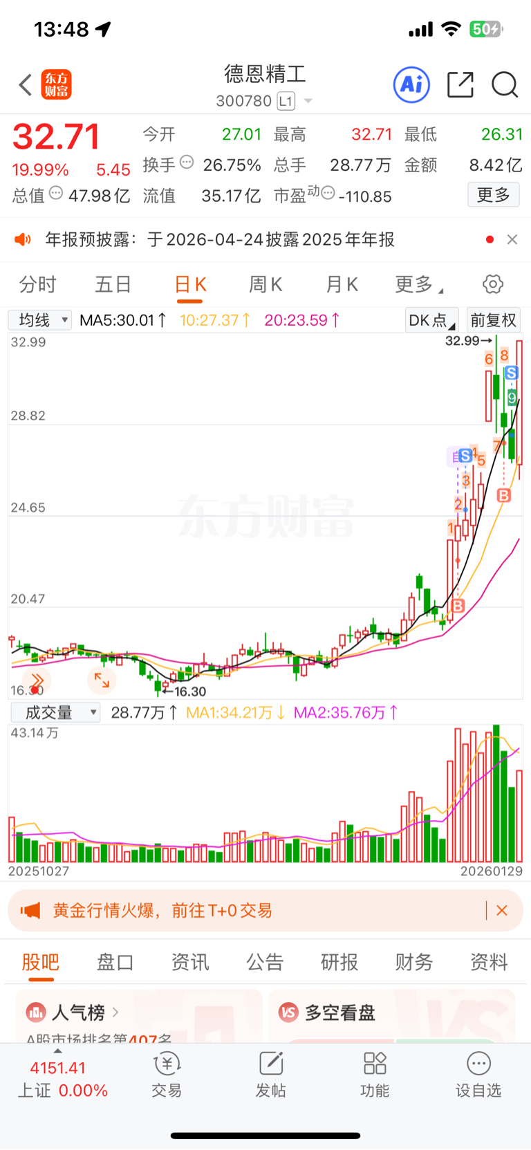 $德恩精工(SZ300780)$ 唉,昨天卖了去蓝色光标吃了-9%