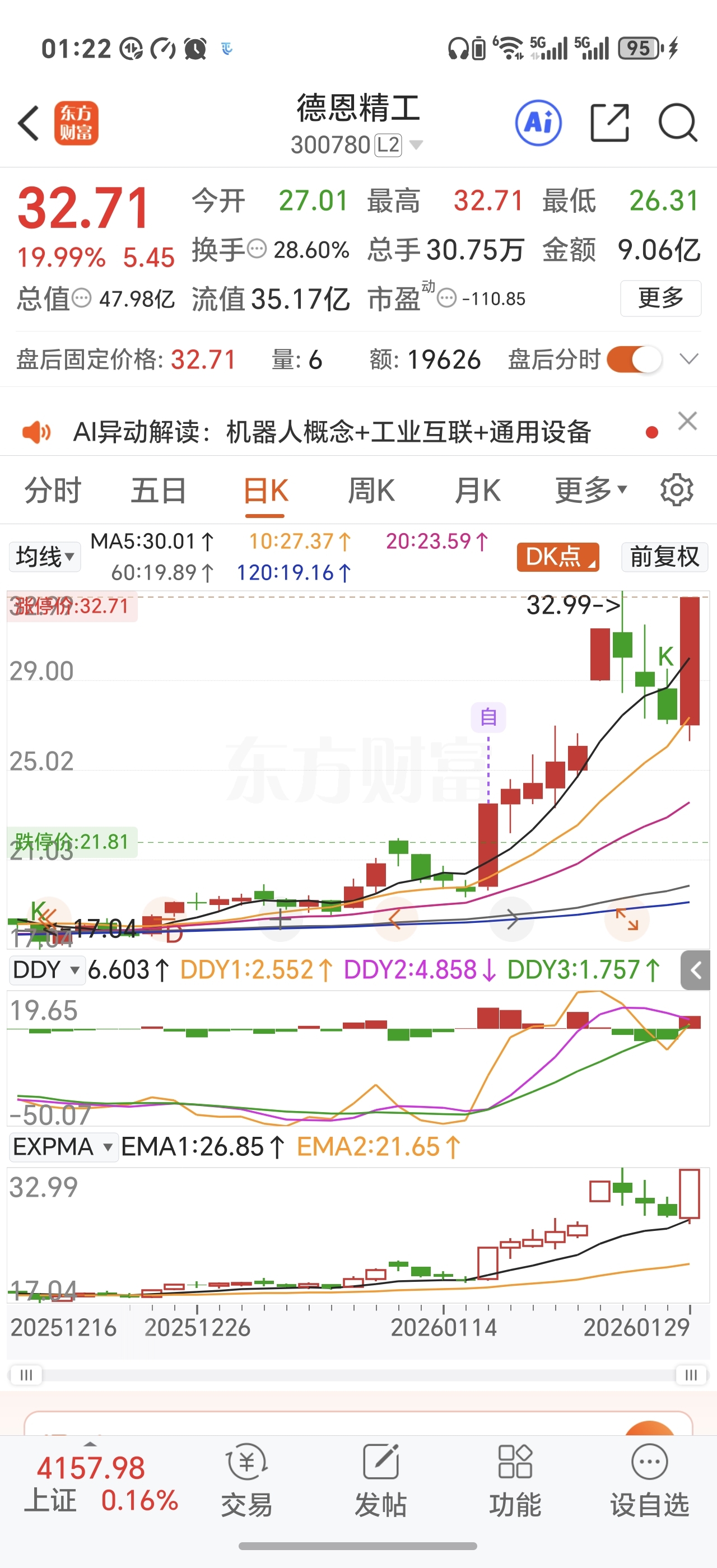 $德恩精工(SZ300780)$ 真的妖,走势完全看不懂,所有的K线理论都没用,眼睁睁看着上天