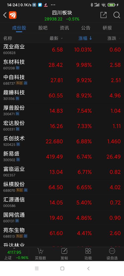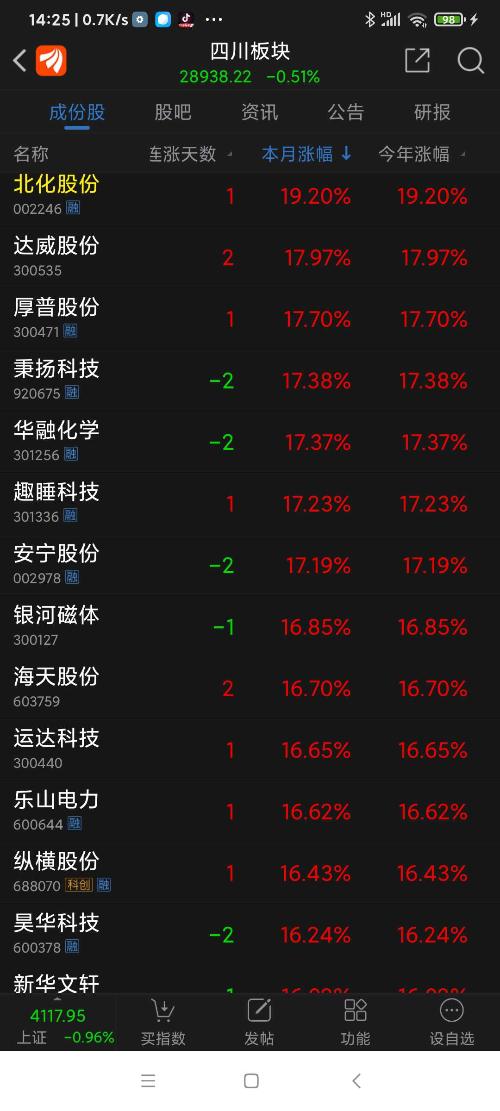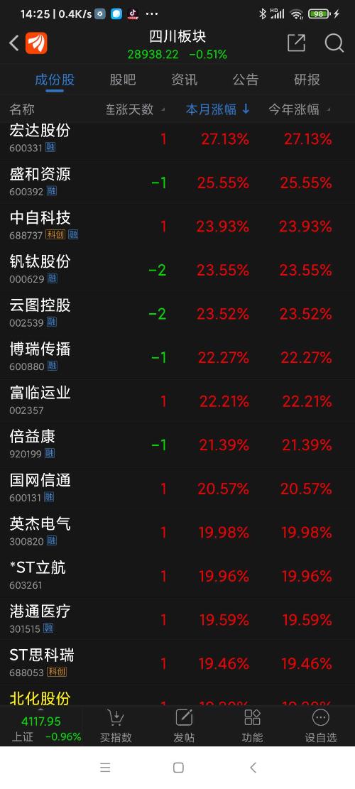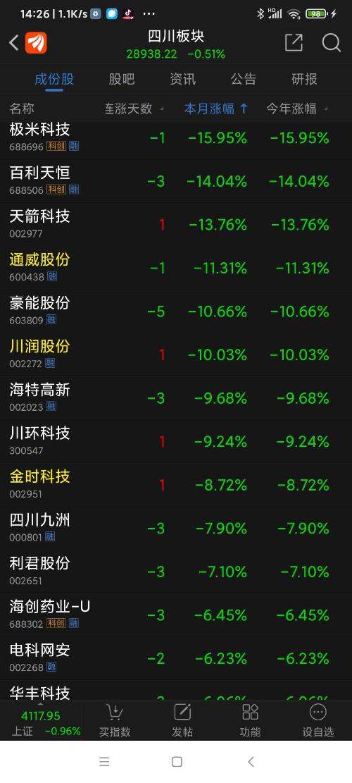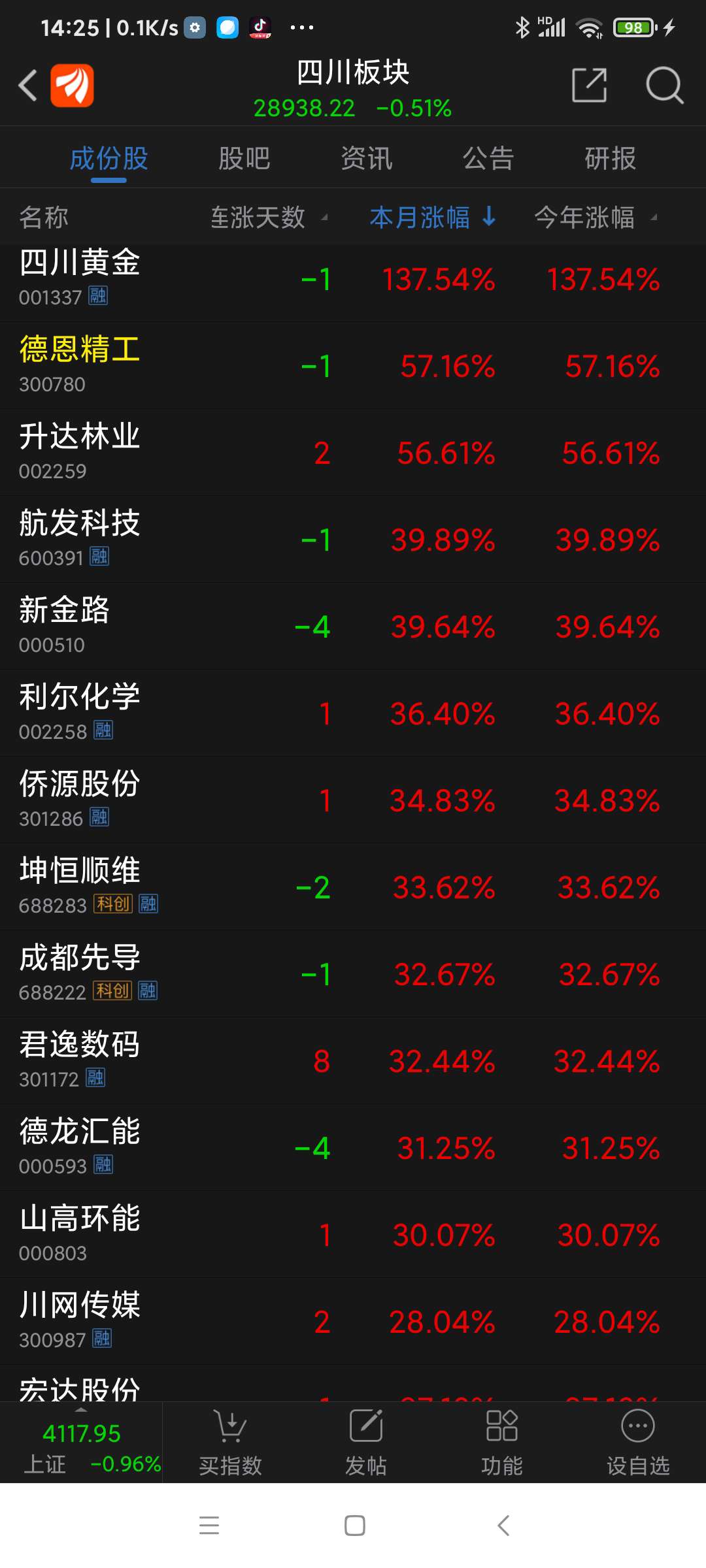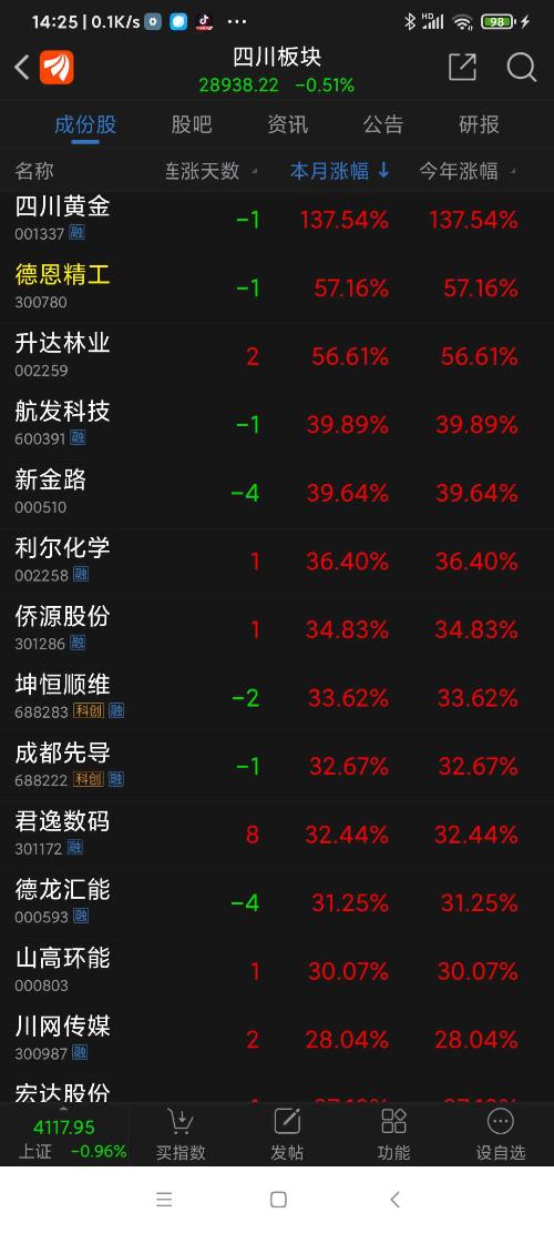 四川板块26年元月涨幅8.15%,德恩精工名列四川板块(共有179个股票)第二名