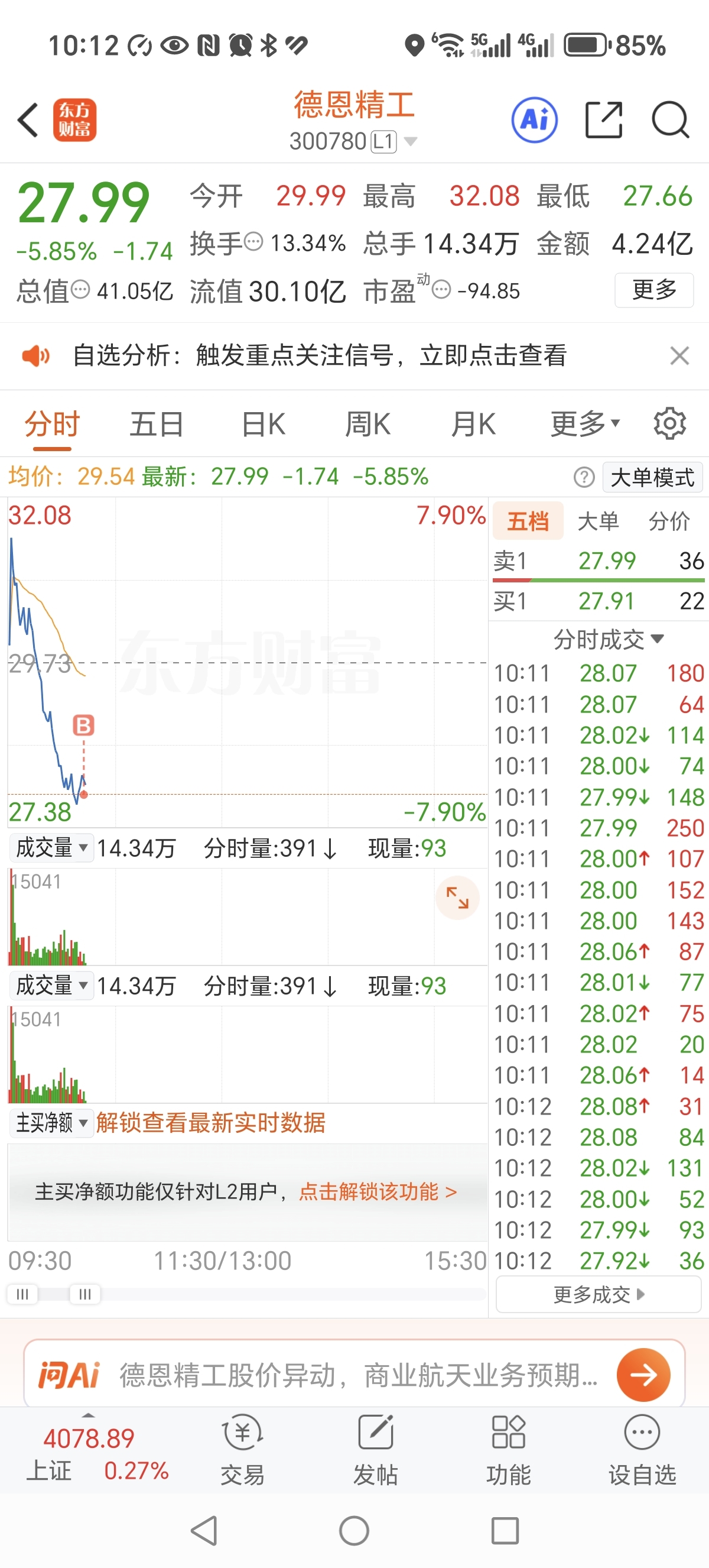 $德恩精工(SZ300780)$ 刚刚设置27.8成交了,这种没好事的,大家悠着点