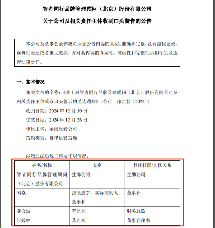 10天后,全国股转公司就关联交易未及时披露、关联方资金占用等问题,对智者品牌及董事长刘焱、财务负责人龚文波、董秘崇婷婷采取口头警示的自律监管措施。