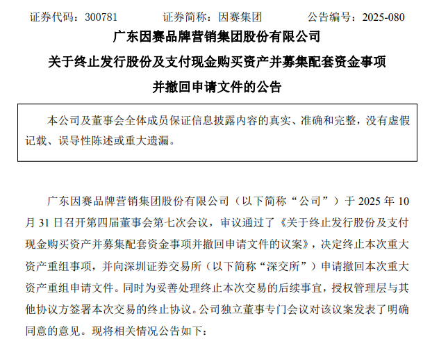 2025年10月31日晚间,因赛集团(300781)突发公告,终止重大资产重组,撤回收购智者同行品牌管理顾问(北京)股份有限公司(下称“智者品牌”)80%股权的申请文件。