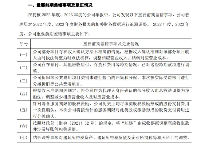 2025年4月8日,智者品牌发布前期会计差错更正公告,对公司对涉及2022年度和2023年度及2024年1-6月的财务报表的相关项目会计差错予以追溯更正。
