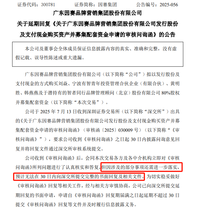 回溯交易时间线,2024年10月22日晚,因赛集团首次公告拟以发行股份及支付现金方式收购智者品牌;2024年10月29日发布交易预案后,进程便陷入停滞,直至2025年6月5日才公布报告书草案。6月30日,深交所受理该交易,7月13日,深交所发出审核问询函,要求公司收到《审核问询函》之日起30日内披露问询意见回复并将回复文件通过深交所审核系统提交。