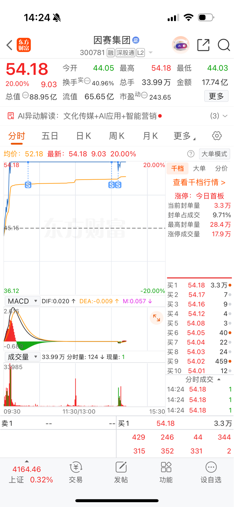 $因赛集团(SZ300781)$ 挂的那一手成交瞬间,全部清仓了,就算回封,也不留恋,吃过亏的,回封的第二天基本都是大低开。