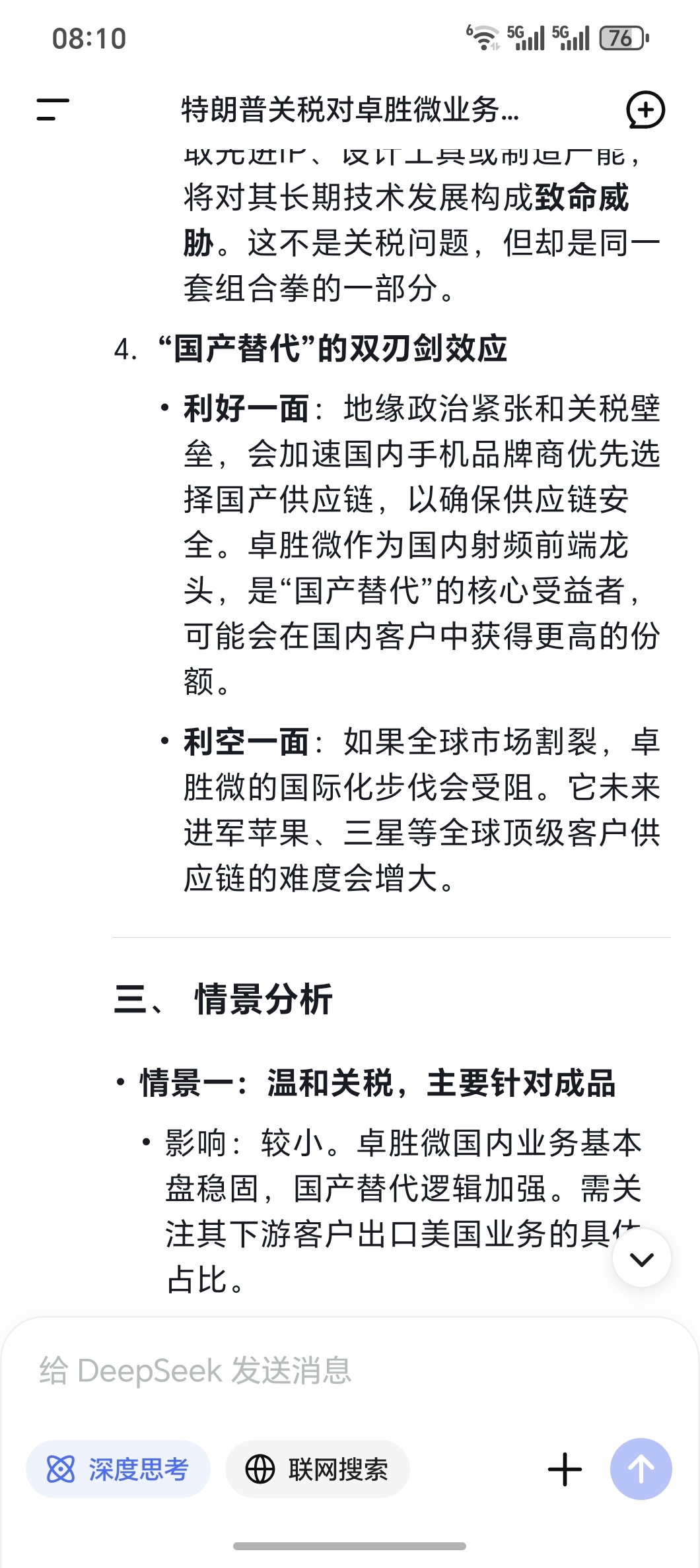 $卓胜微(SZ300782)$ 问了deepseek说加关税对你的影响如何