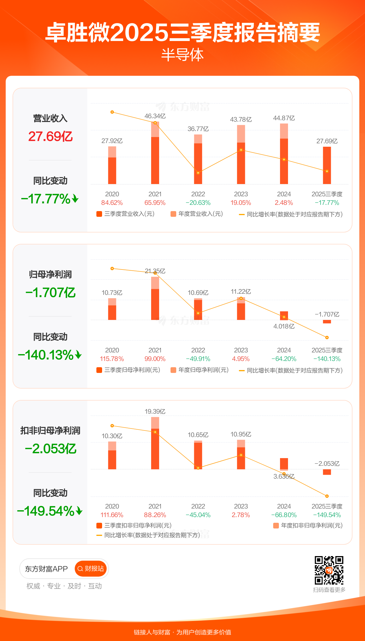 卓胜微10月30日发布2025年三季报显示,公司前三季实现营业收入27.69亿元,同比下滑17.77%;归母净利润-1.71亿元;扣非归母净利润-2.05亿元。