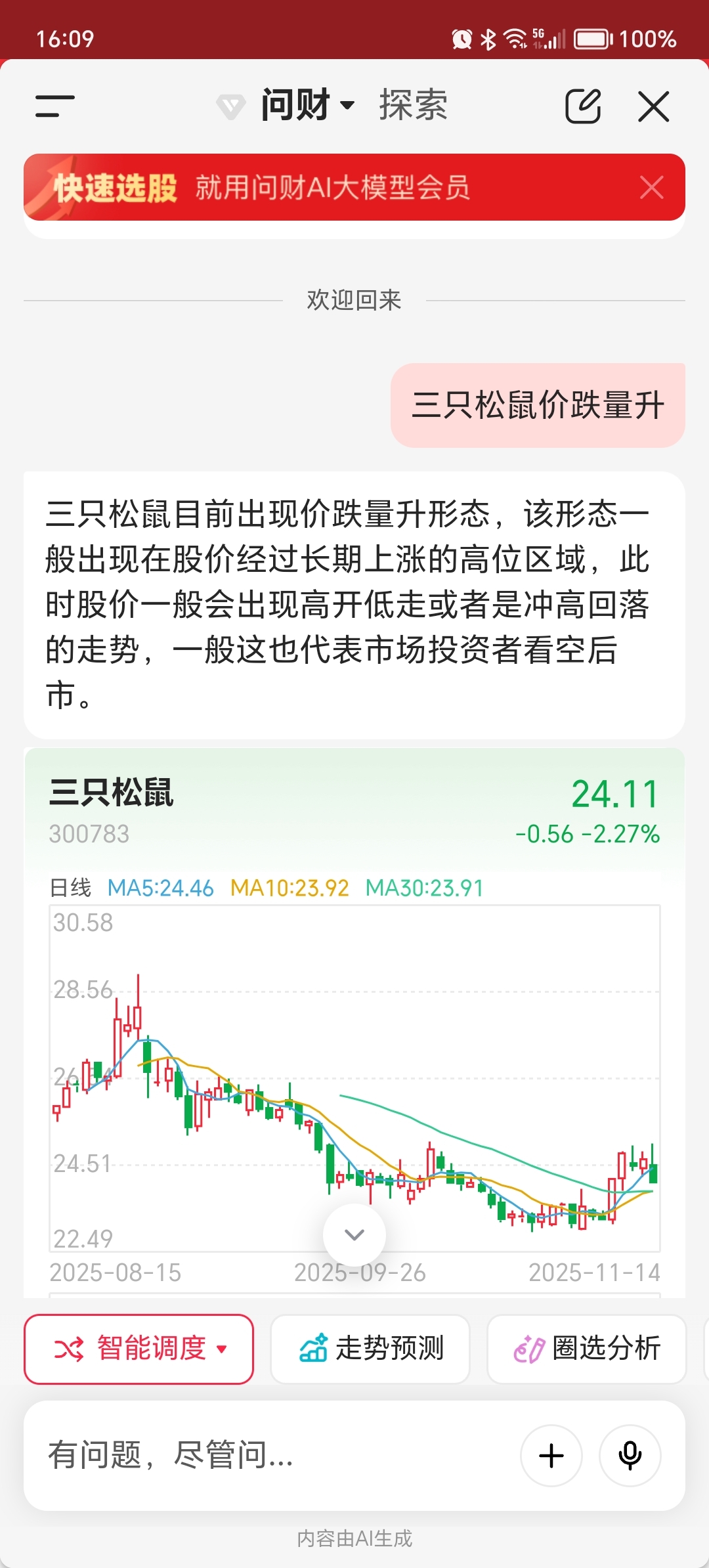 $三只松鼠(SZ300783)$ 问财也学会扯淡了,还一般出现在长期上涨的高位区域,高个锤子老鼠都跌成狗了