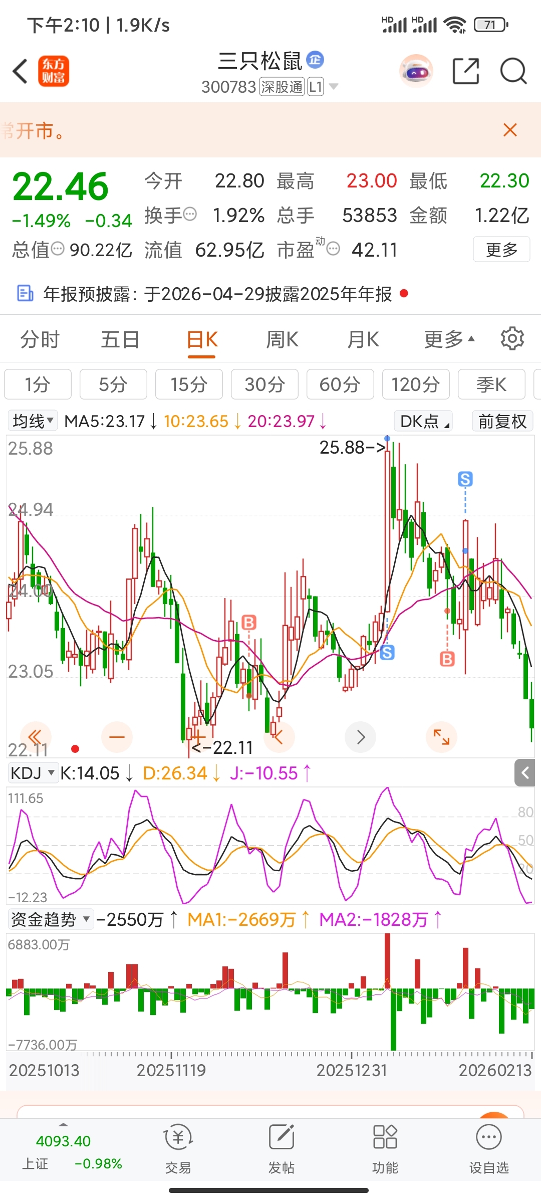$三只松鼠(SZ300783)$ 到这里就很好理解了。有3种可能区间震荡,一路下杀破22,大资金暴力拉升,这3种可能只为收复日线颓势。不收复的话一路阴跌,直到收复为止,那时候就是第一买点