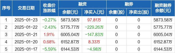 利安科技:融资净买入97.81万元,融资余额5873.58万元(01-23)
