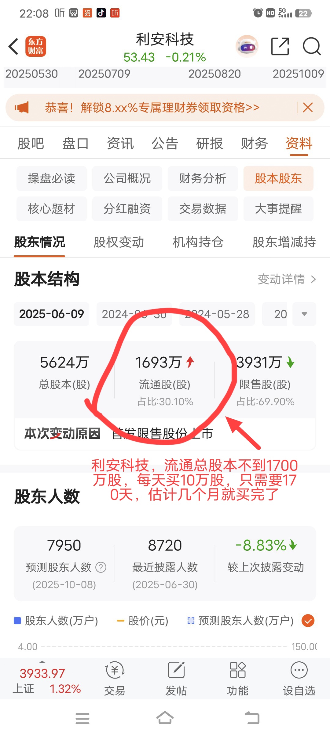快点起飞,1700万股的总股本,你不卖,我不卖,大家一起去迪拜;你也卖,我也卖,