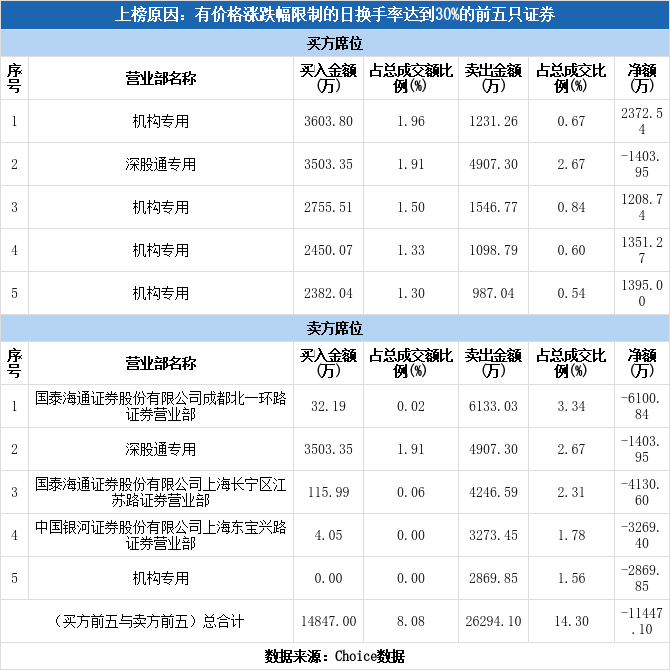 龙虎榜数据显示,今日共5个机构席位出现在龙虎榜单上,分别位列买一、买三、买四、买五、卖五,合计净买入3457.69万元,占该股今日总成交额的1.88%。除此之外还有众生药业、时空科技、海陆重工等41只个股榜单上出现了机构的身影,其中18家呈现机构净买入,获净买入最多的是时空科技,净买额为2.08亿元;23家呈现机构净卖出,其中遭净卖出最高的为众生药业,净卖额为2.37亿元。
