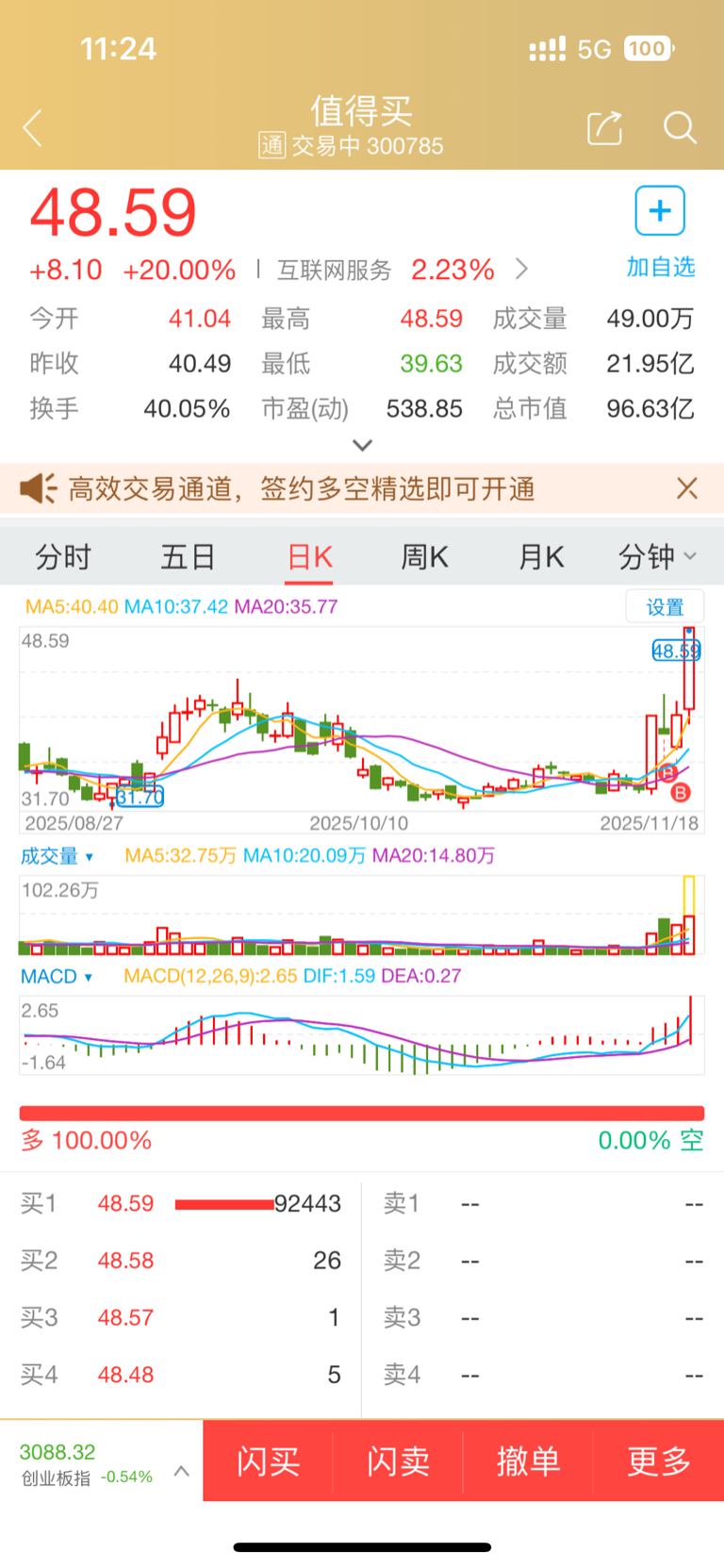 $值得买(SZ300785)$ 起初指望涨停,冲高没卖。后来看看不对了,回落就卖掉点吧