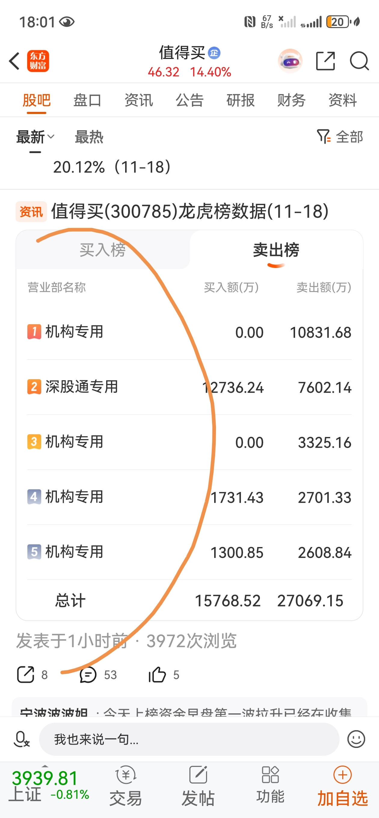 $值得买(SZ300785)$ 全是机构卖出。机构还是聪明啊