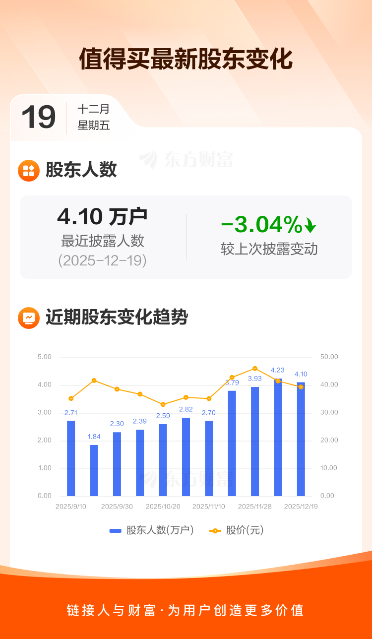 值得买:截至12月19日最新股东户数4.10万户,较上期减少3.04%