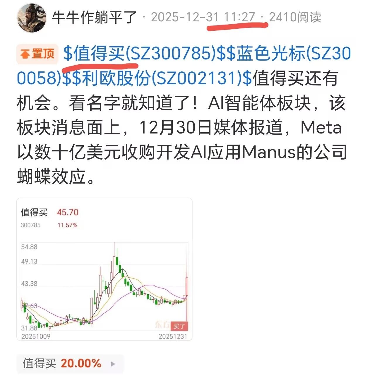 $值得买(SZ300785)$ $天龙集团(SZ300063)$ $易点天下(SZ301171)$ AI应用最早是12月初发的专题,第一波行情没起来,但从12月30日开始发帖,12月31日明确利欧、值得买、蓝色,如今全部翻倍